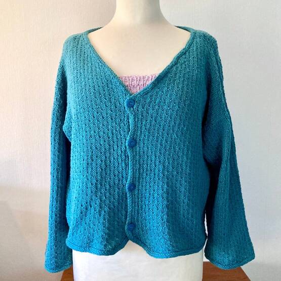 Hantverk för Musikhjälpen: turkos stickad kofta i bomull och lin, stl M
